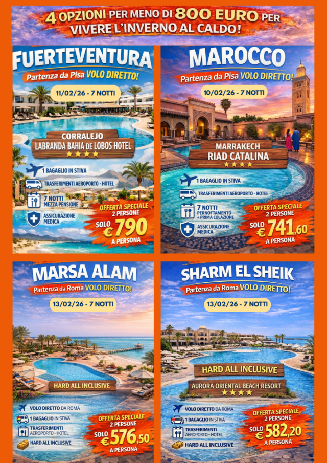 L’INVERNO AL CALDO 2026     ✈️ 4 OPZIONI PER VIVERE L’INVERNO AL CALDO (sotto gli 800€)    Lascia il freddo, scegli il caldo Abbiamo selezionato 4 destinazioni con volo diretto e soggiorni di 7 notti, perfette per chi vuole staccare e ricaricarsi.   Fuerteventura – Corralejo Resort 4★, mezza pensione, trasferimenti inclusi 11/02/26 –...