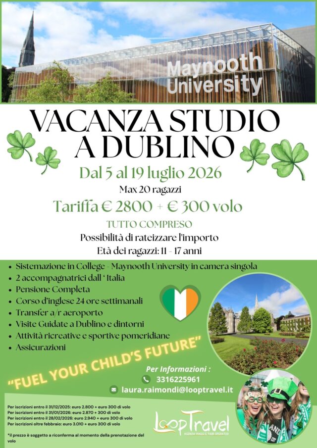 VACANZA STUDIO 2026 IN IRLANDA PER RAGAZZI   In collaborazione con Laura Raimondi, accompagnatrice del nostro staff , organizziamo un viaggio studio estivo a Dublino pensato per offrire ai ragazzi di età compresa fra 11 e 17 anni un’opportunità unica di apprendere l’inglese in un contesto immersivo, stimolante e divertente.     5 – 19...